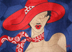 and lips. The neck scarf and hat ribbon in red