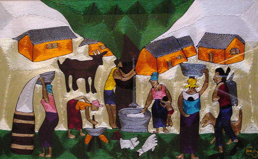 Very colorful artwork depicting villagers making baskets, preparing food, tending livestock, and performing other chores, A background picture of a settlement with thatched huts and grazing cattle.
